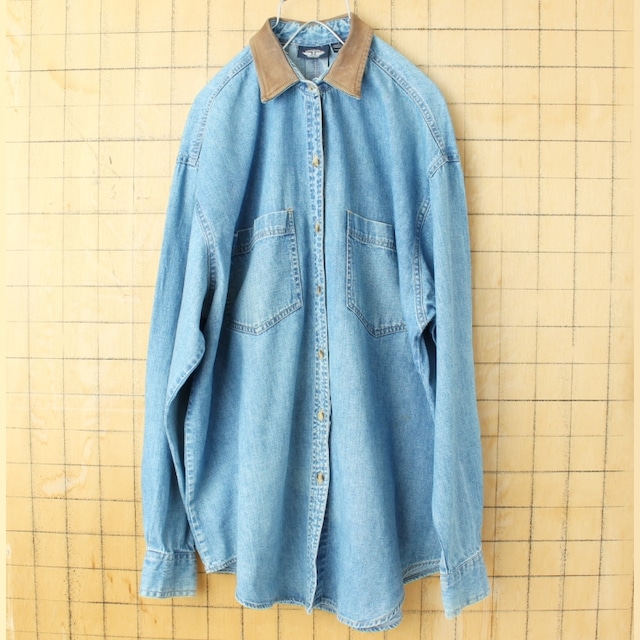 90s USA DOCKERS ドッカーズ 襟レザー 長袖デニムシャツ レディースL ブルー アメリカ古着 011426aw13