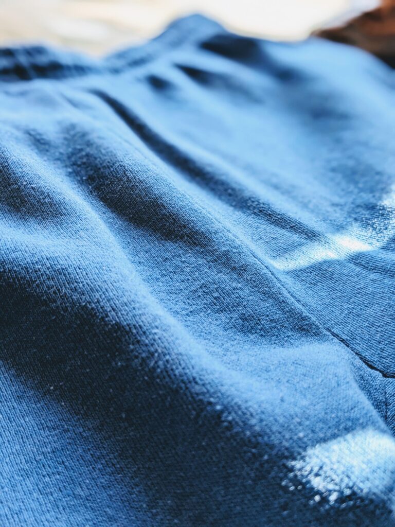 ボディカラーはブルー、中肉の柔らかい生地感です。