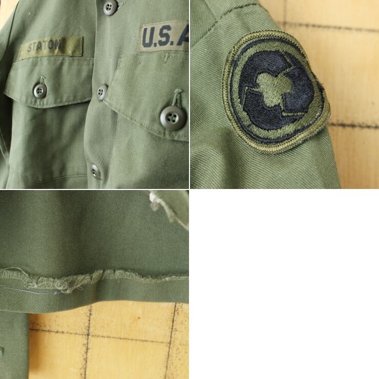 70s 80s U.S.ARMY OG-507 ユーティリティ リメイク シャツ メンズSM相当 ミリタリー ワッペン アメリカ古着 pan-615