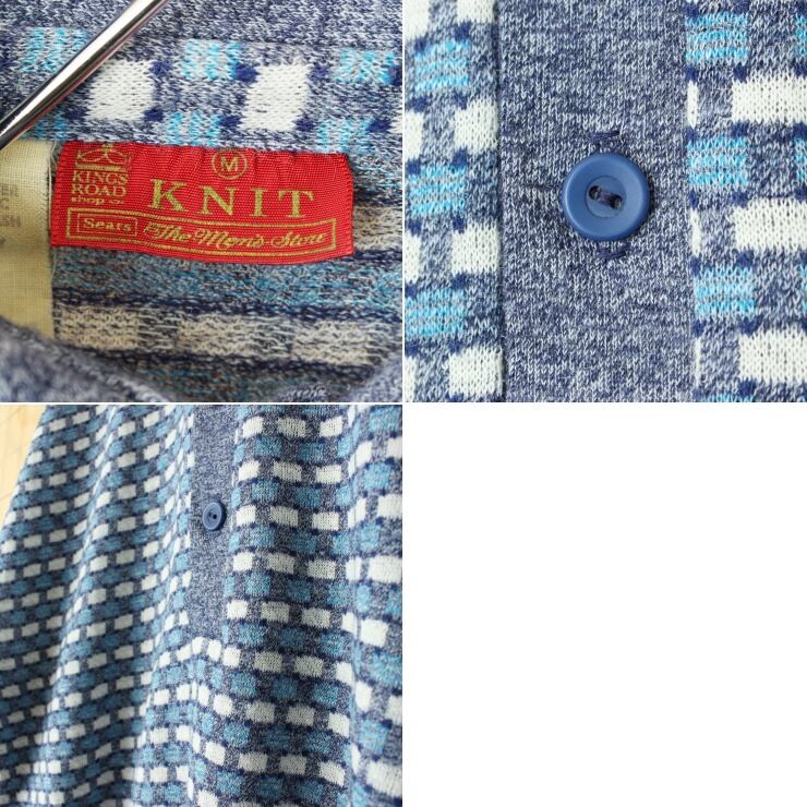 70s 80s USA Sears 総柄 ニット 長袖ポロシャツ メンズM ブルー アメリカ古着 031225ss19