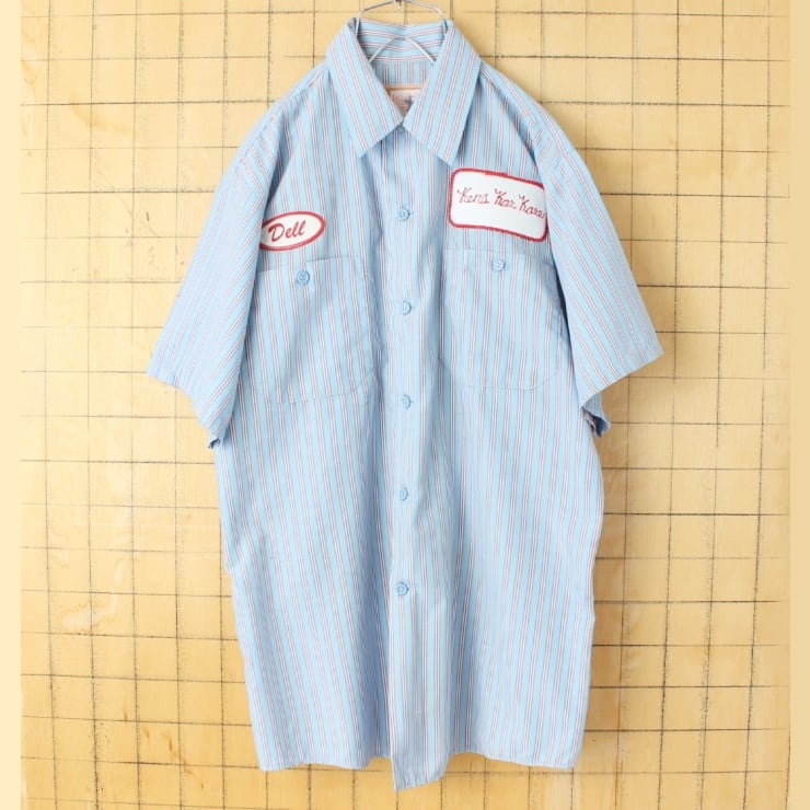 70s 80s USA製 ワッペン ストライプワークシャツ ライトブルー メンズL相当 半袖 アメリカ古着 050725ss144