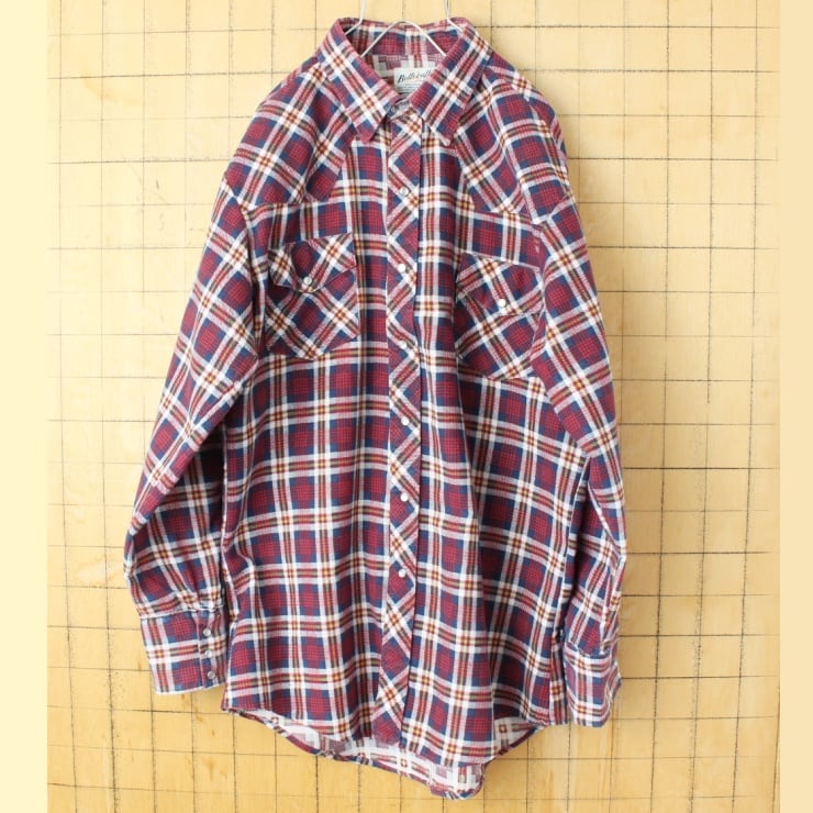 60s 70s USA製 Bellcraft プリント チェック ウエスタン シャツ レッド メンズL相当 長袖 アメリカ古着です。