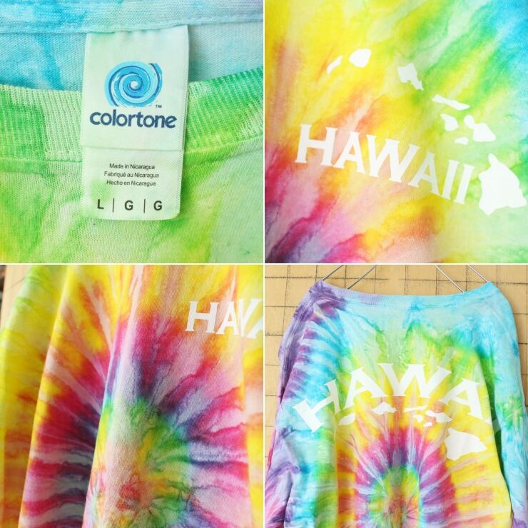 USA colortone HAWAII 両面プリント タイダイ長袖Tシャツ ロンT メンズL カラフル アメリカ古着です。