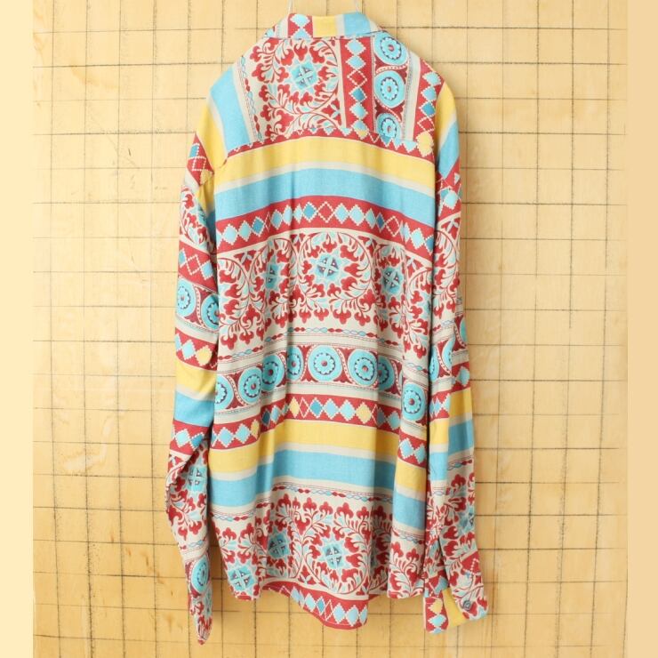 ビッグサイズ 80s 90s EUROMODE 長袖 総柄レーヨンシャツ レッド ブルー メンズ2XL相当 ヨーロッパ古着 071625ss37