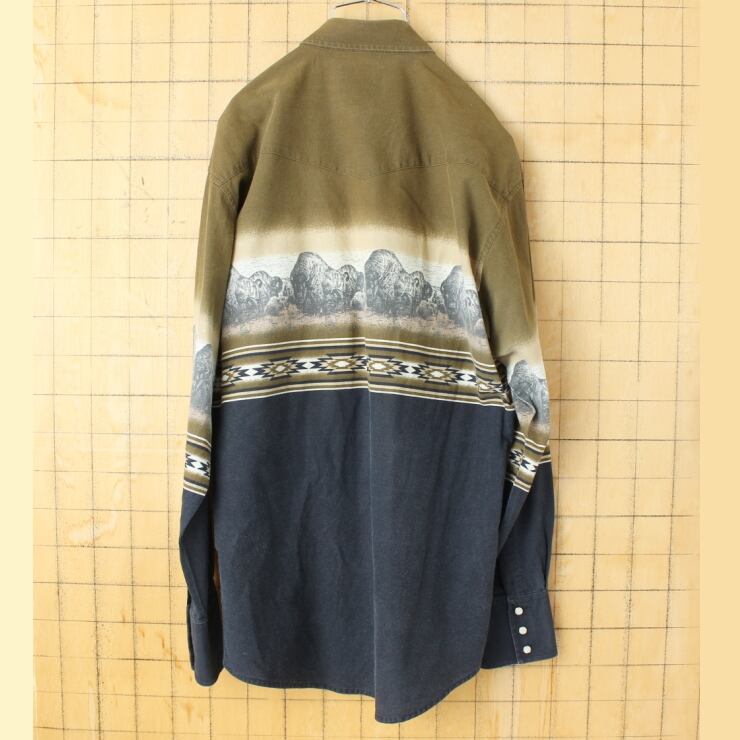 80s 90s USA Wrangler ラングラー バッファロー柄ウエスタンシャツ ブラック メンズML相当 長袖 アメリカ古着 082725aw119