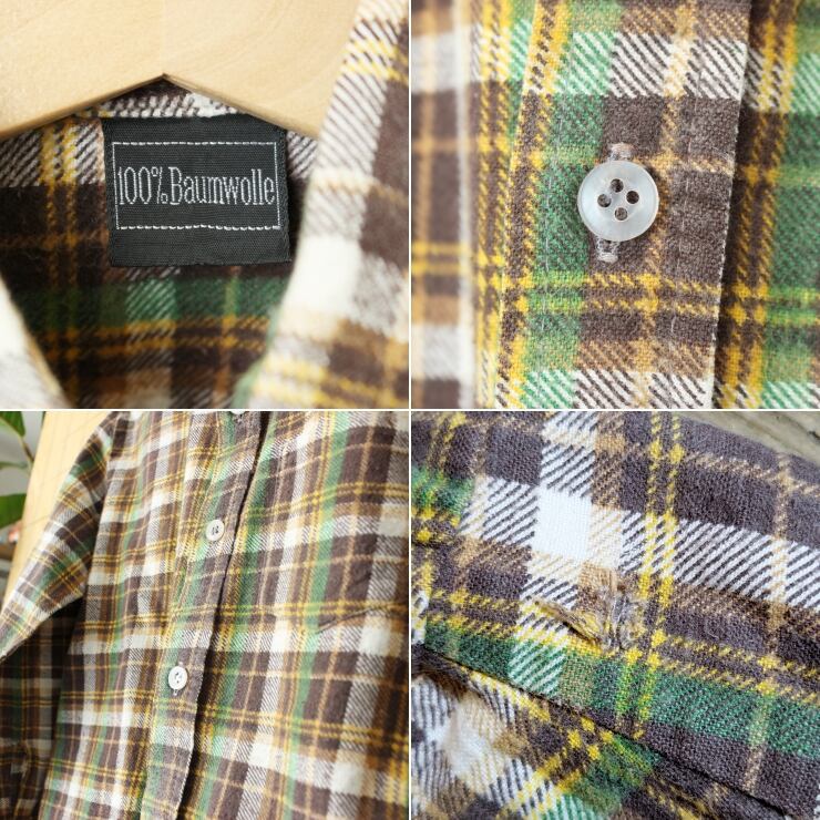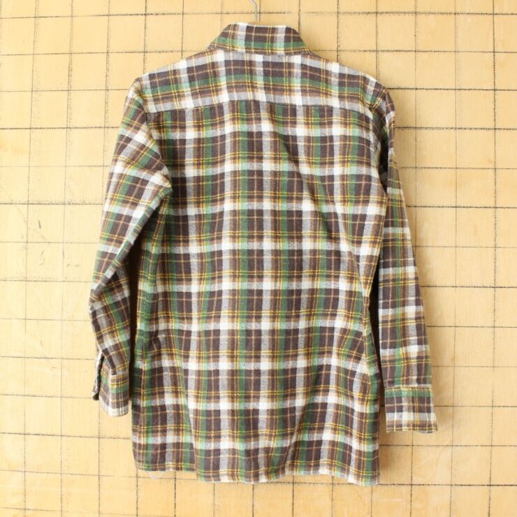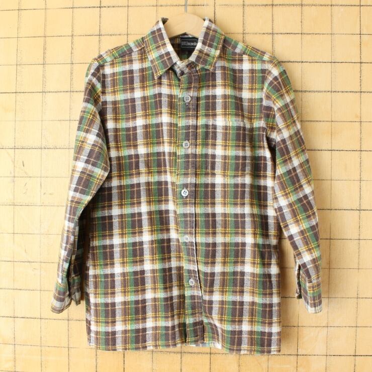 70s 80s EURO キッズ コットンプリントチェックシャツ 140cm相当 ブラウン グリーン ヨーロッパ古着 092425aw160