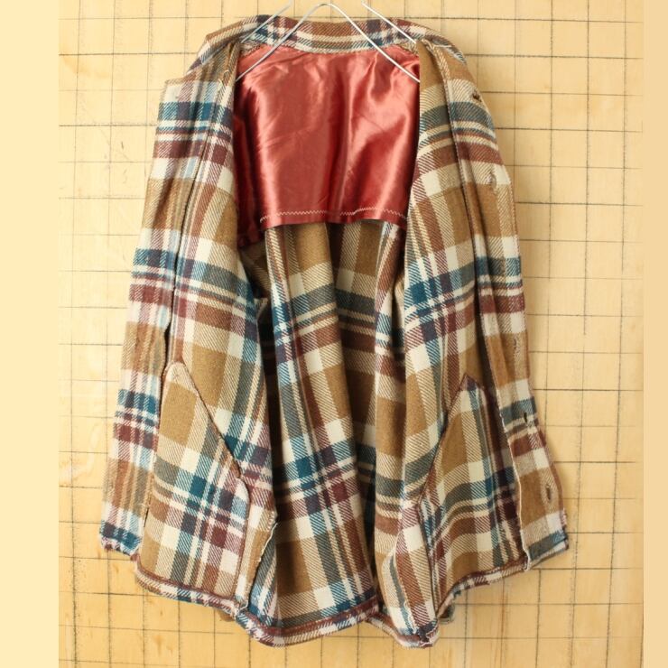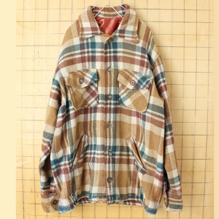 60s 70s USA チェックウールジャケット メンズL相当 ベージュ ブラウン アメリカ古着 092425aw29
