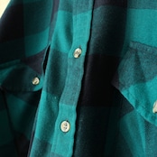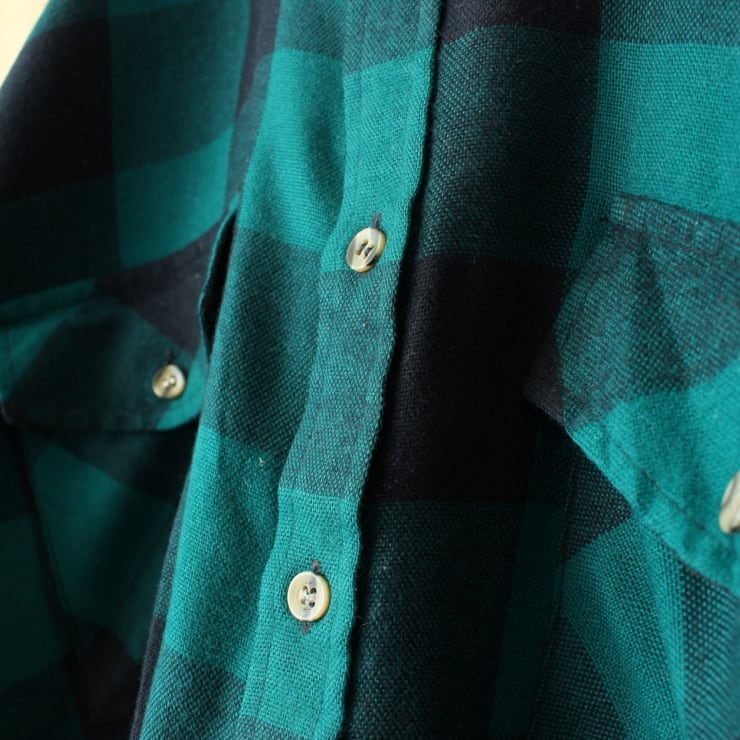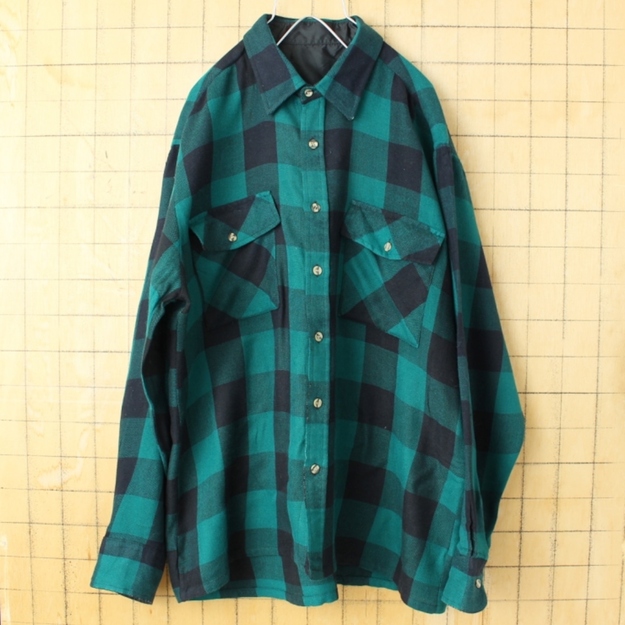 80s 90s USA ブロックチェックアクリルシャツ グリーン ブラック メンズL相当 長袖 ボックスシルエット アウトドア アメリカ古着です。