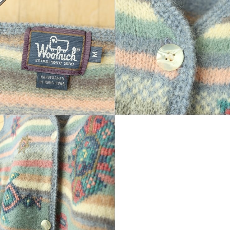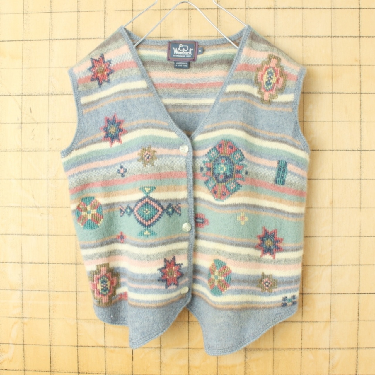 80s 90s USA Woolrich 総柄ウールニットベスト レディースM ブルー アメリカ古着 011426aw59