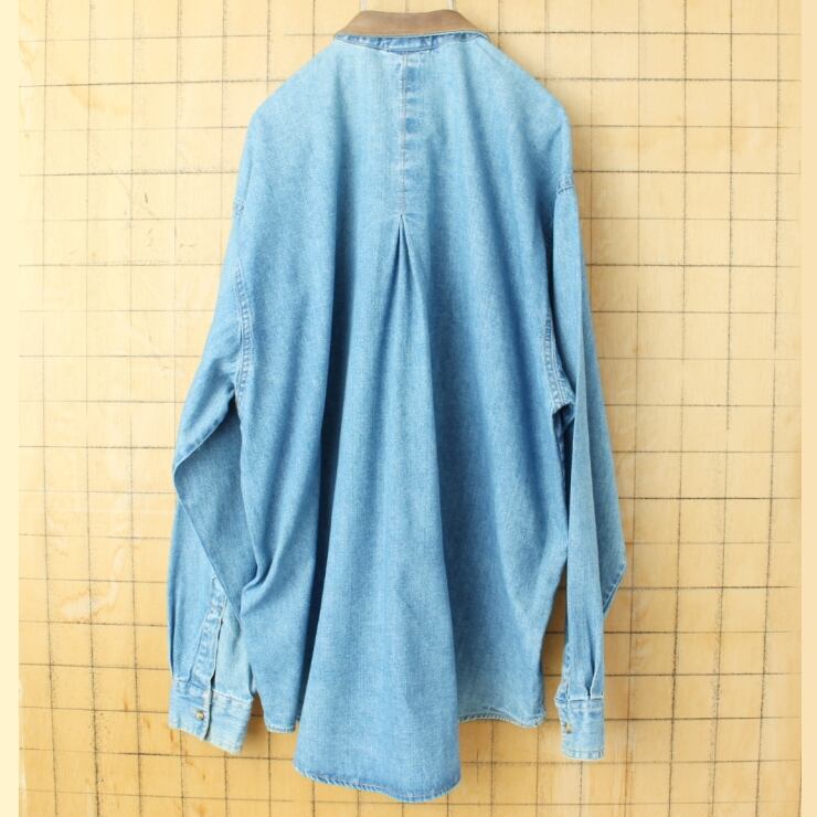90s USA DOCKERS ドッカーズ 襟レザー 長袖デニムシャツ レディースL ブルー アメリカ古着 011426aw13