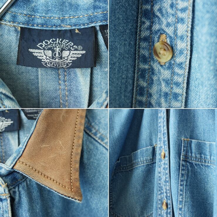 90s USA DOCKERS ドッカーズ 襟レザー 長袖デニムシャツ レディースL ブルー アメリカ古着です。