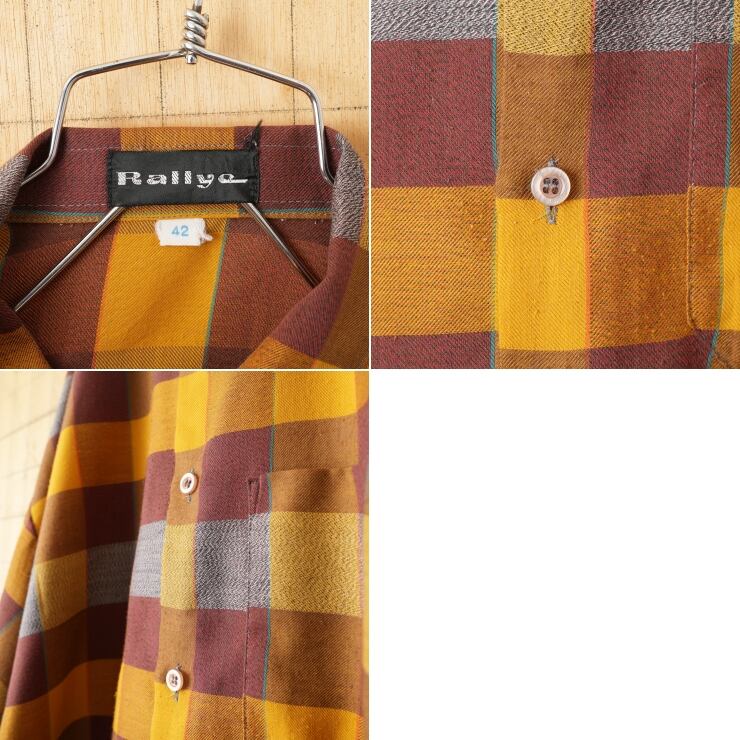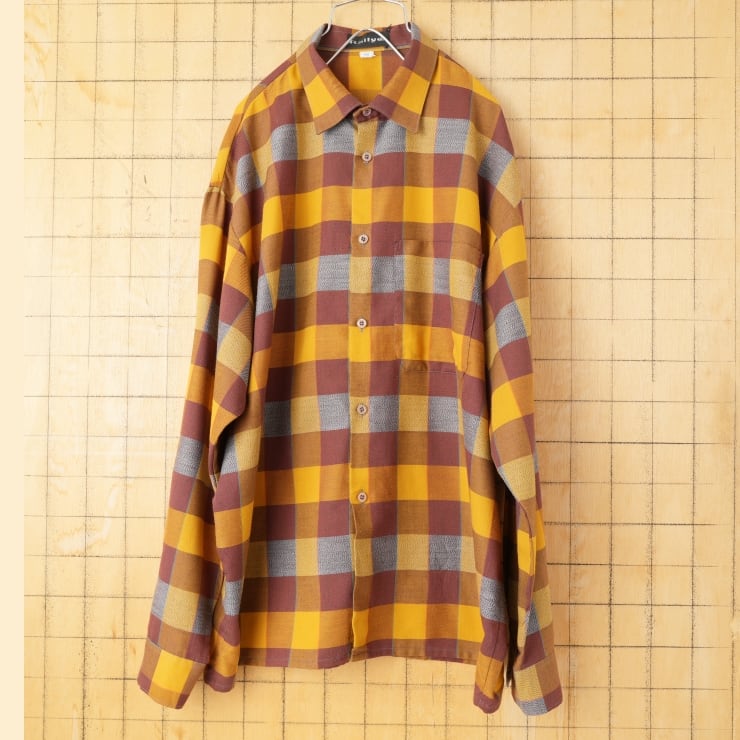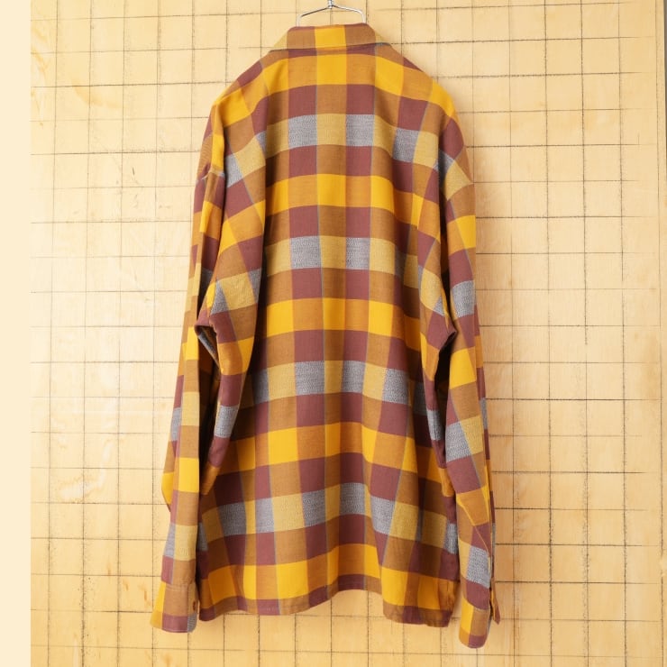 70s 80s EURO Rallye ライトフランネルチェックシャツ イエロー ブラウン メンズL相当 長袖 ヨーロッパ古着 031926ss2