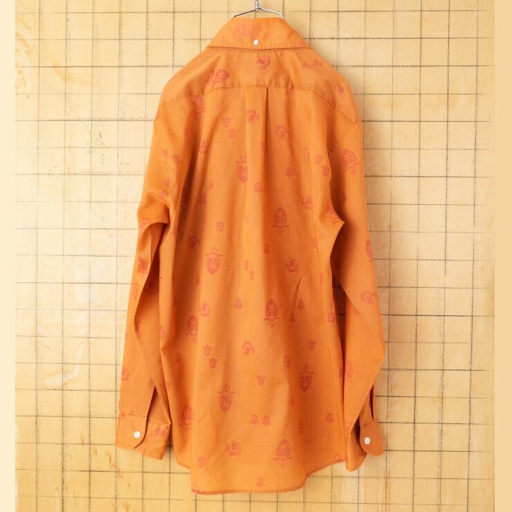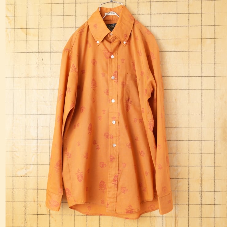 70s 80s USA Sears ライトフランネル総柄ボタンダウンシャツ オレンジ メンズM 長袖 アメリカ古着 031926ss55