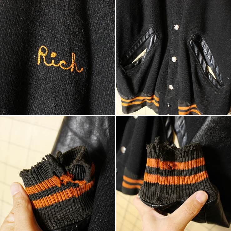 60s USA製 DeLong メルトンウール レザー スタジャン 袖革 チェーンステッチ アワード バーシティジャケット ブラック メンズS相当 古着です。