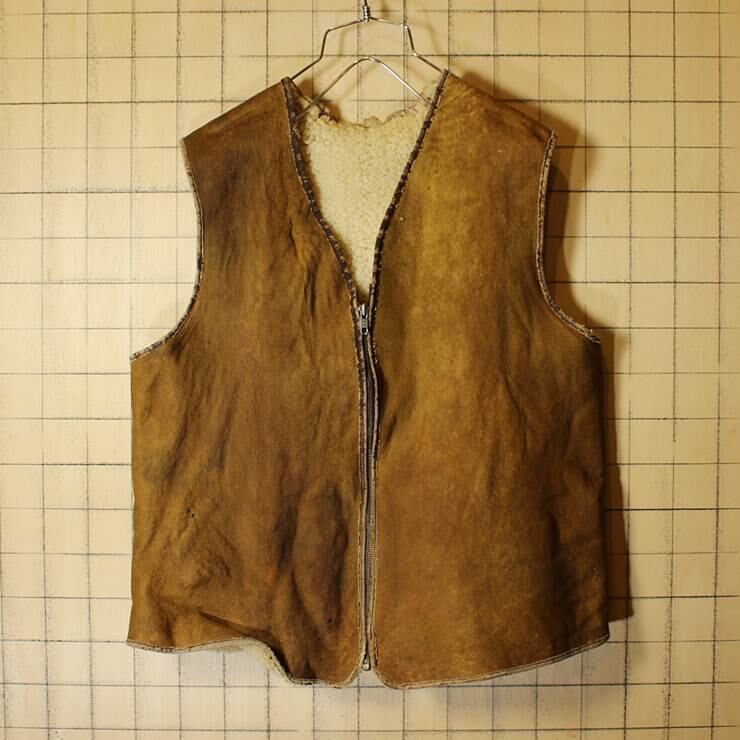 70s-80s フランス 古着 ムートン ボア ベスト メンズML相当 ブラウン ベージュ レザー アウトドア ダメージです。