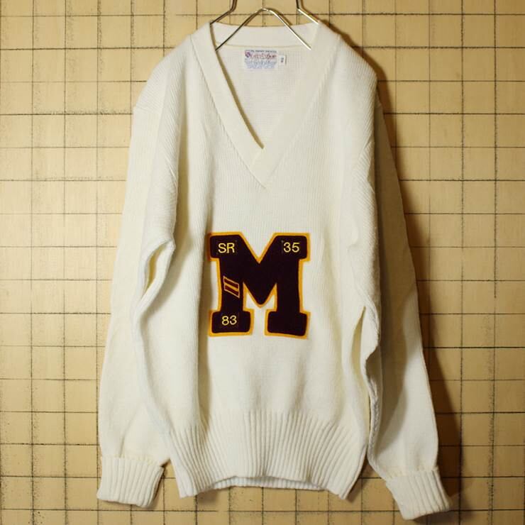 70s EAST-TENN アクリル ニット レタード セーター メンズM相当 ホワイト ビンテージ 古着 ss37