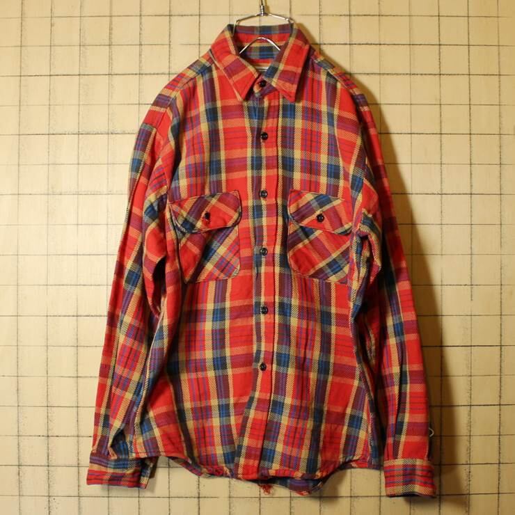 FIVE BROTHER ヘビー ネルシャツ USA製 70s-80s 古着 レッド イエロー チェック ワーク メンズM ダメージです。