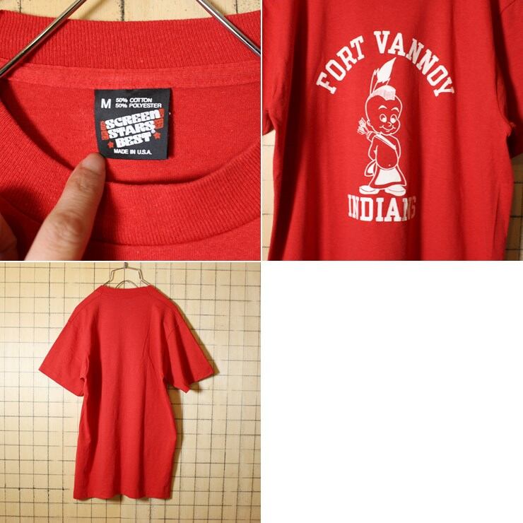 古着 USA製 キャラクター プリント Tシャツ 半袖 レッド メンズM SCREEN STARS BEST FORT VANNOY INDIANS インディアンです。