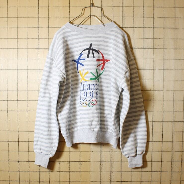 90's USA製 Velva Sheen 古着 プリント スウェット ライトグレー ホワイト ボーダー トレーナー ADULT Mサイズ 1996 Atlanta オリンピックです。