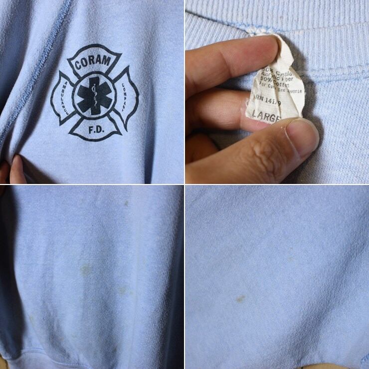 USA製 古着 プリント ラグラン スウェット ライトブルートレーナー メンズL CORAM