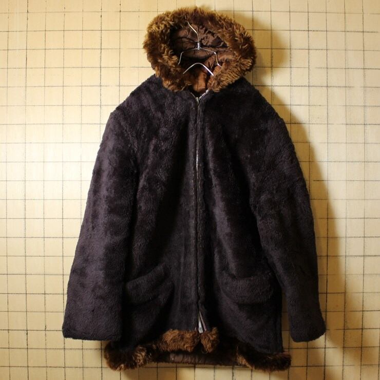 60s 古着 ボア ファーフード ジップアップ ジャケット ブラウン レディースM相当 メンズS相当 キルティング