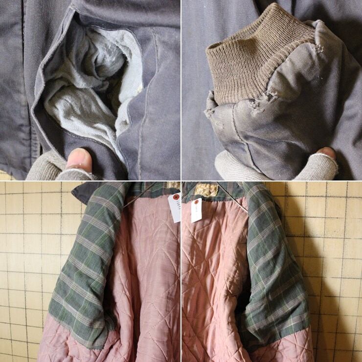 袖口や襟、裾に擦り切れがあります。裏地のダメージは当店にてビンテージ生地を使用しリペア致しました。