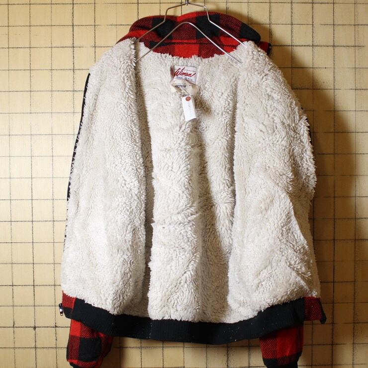 USA製 古着 Wiman チェック 裏ボア ウール ジャケット レッド ブラック メンズM ワッペン ワーク