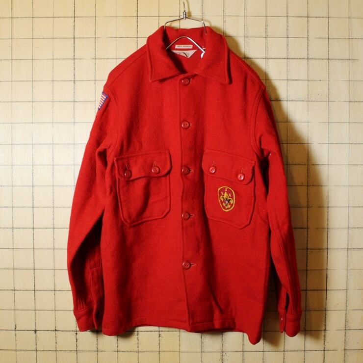 60s USA製 古着 レッド 長袖 ウール ボックスシャツ メンズS相当 ワッペン BOY SCOUTS OF AMERICA ボーイスカウト