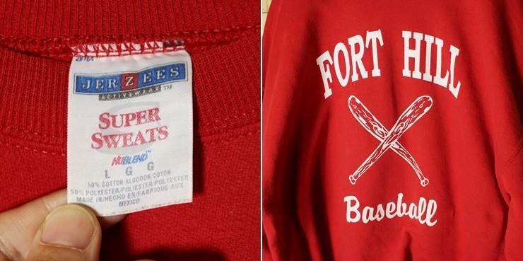 JERZEES レッド プリントスウェット トレーナー メンズL FORT HILL Baseball 古着です。