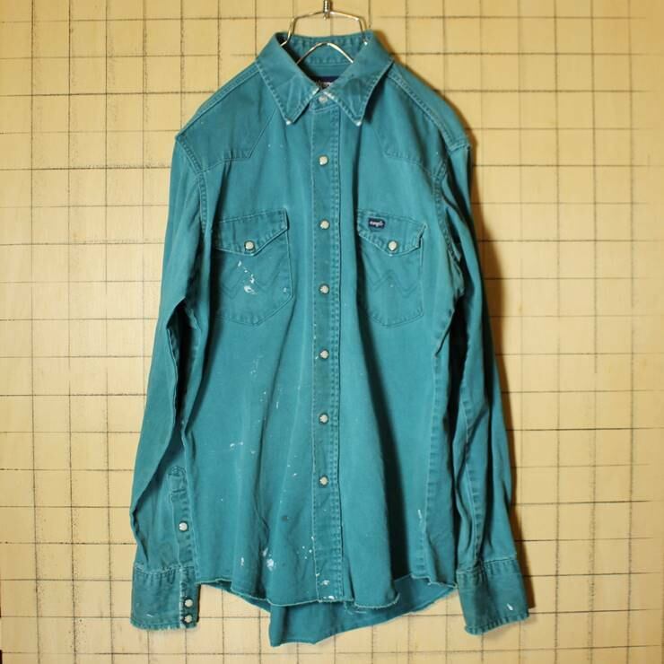 80s USA製 Wrangler ラングラー 古着 ウエスタン コットン シャツ 長袖 グリーン メンズM相当 ペンキ跡 021319ss71