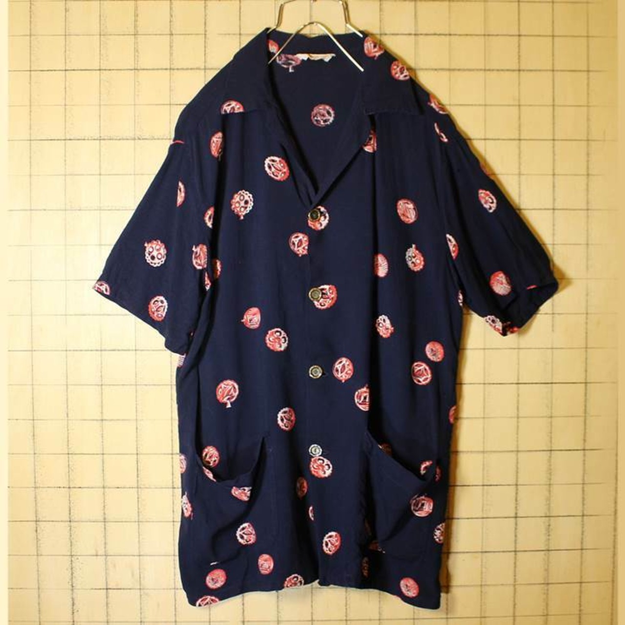 1950s MIAMI製 Alcon 総柄プリント 半袖 レーヨンボックスシャツ ネイビー メンズL カバナ 古着 042419ss92
