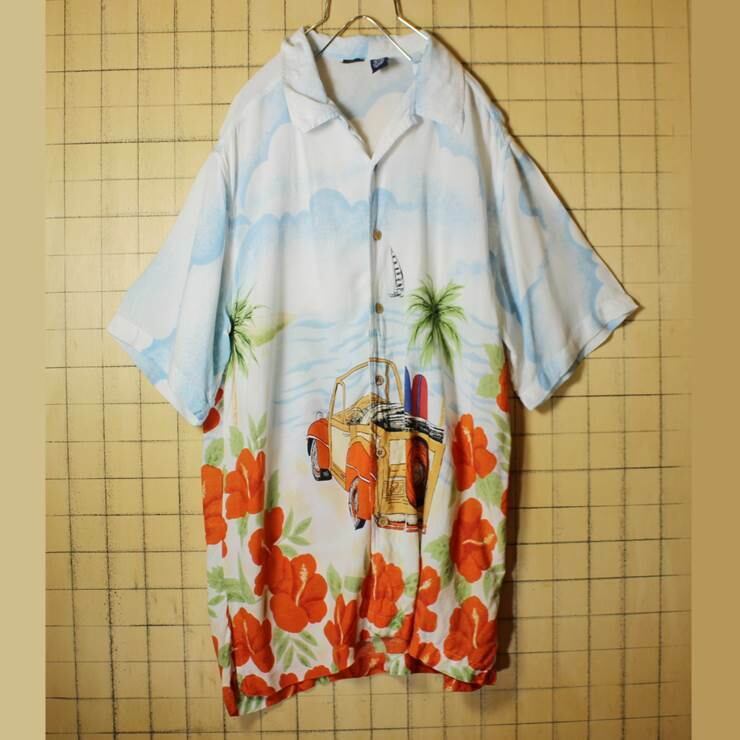 CHEROKEE クラシックカー 総柄 アロハ ハワイアン レーヨン ボックス オープンカラーシャツ ホワイト メンズM 海 半袖 古着 042419ss155