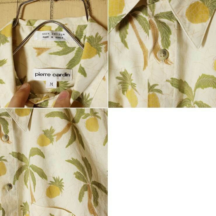 パイナップル 総柄 アロハ ハワイアン コットン ボックス シャツ ベージュ メンズM 半袖 古着 pierre cardinです。