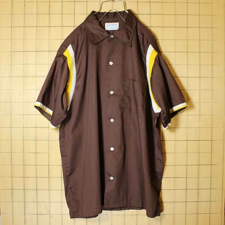 70s USA製 Hilton ヒルトン ボウリングシャツ チェーンステッチ 半袖 ブラウン メンズL 古着 HotelHarley Shuffle Team 070319ss111