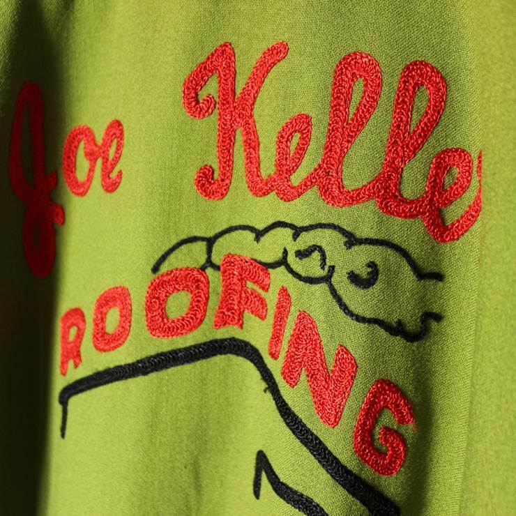 左胸と左肩背面にネームステッチ、背面には”Joe Keller ROOFING”とチェーンステッチが入ります。