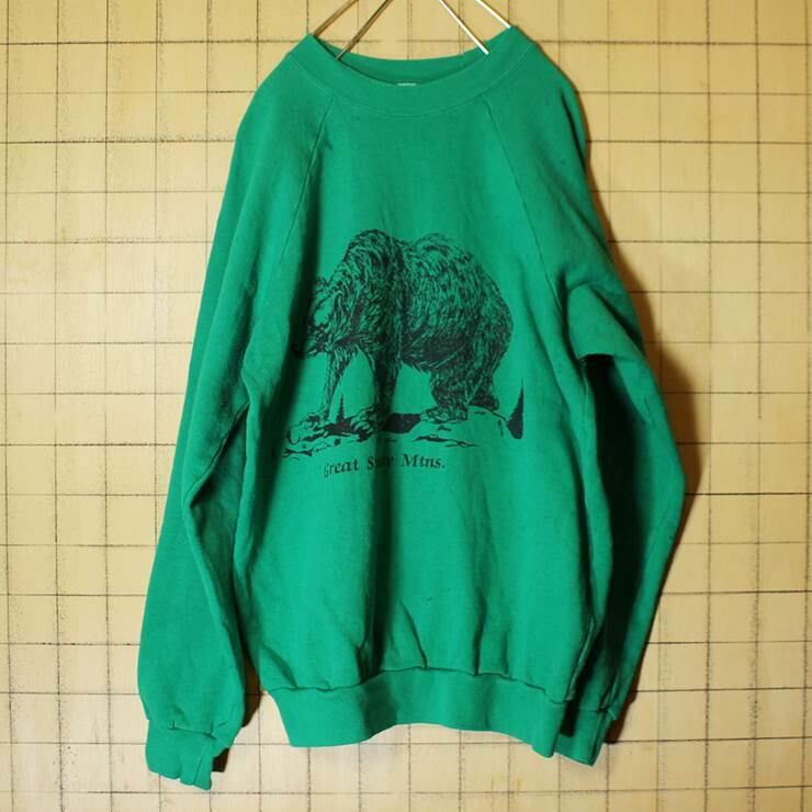 USA製 アニマル プリント スウェット グリズリーベアー グリーン ラグラン トレーナー メンズL 古着 091319aw15