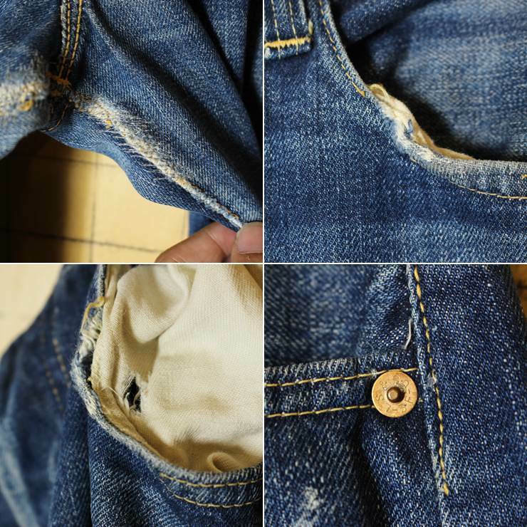 左フロントポケットに擦れによるホールダメージ、股内側にリペア跡、ヒップステッチにリペア跡があります。その他、擦れなどございます。