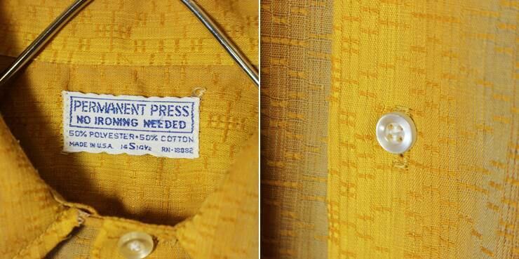 60s 70s USA製 長袖 シャツ 総柄 織模様 イエロー メンズS 古着です。