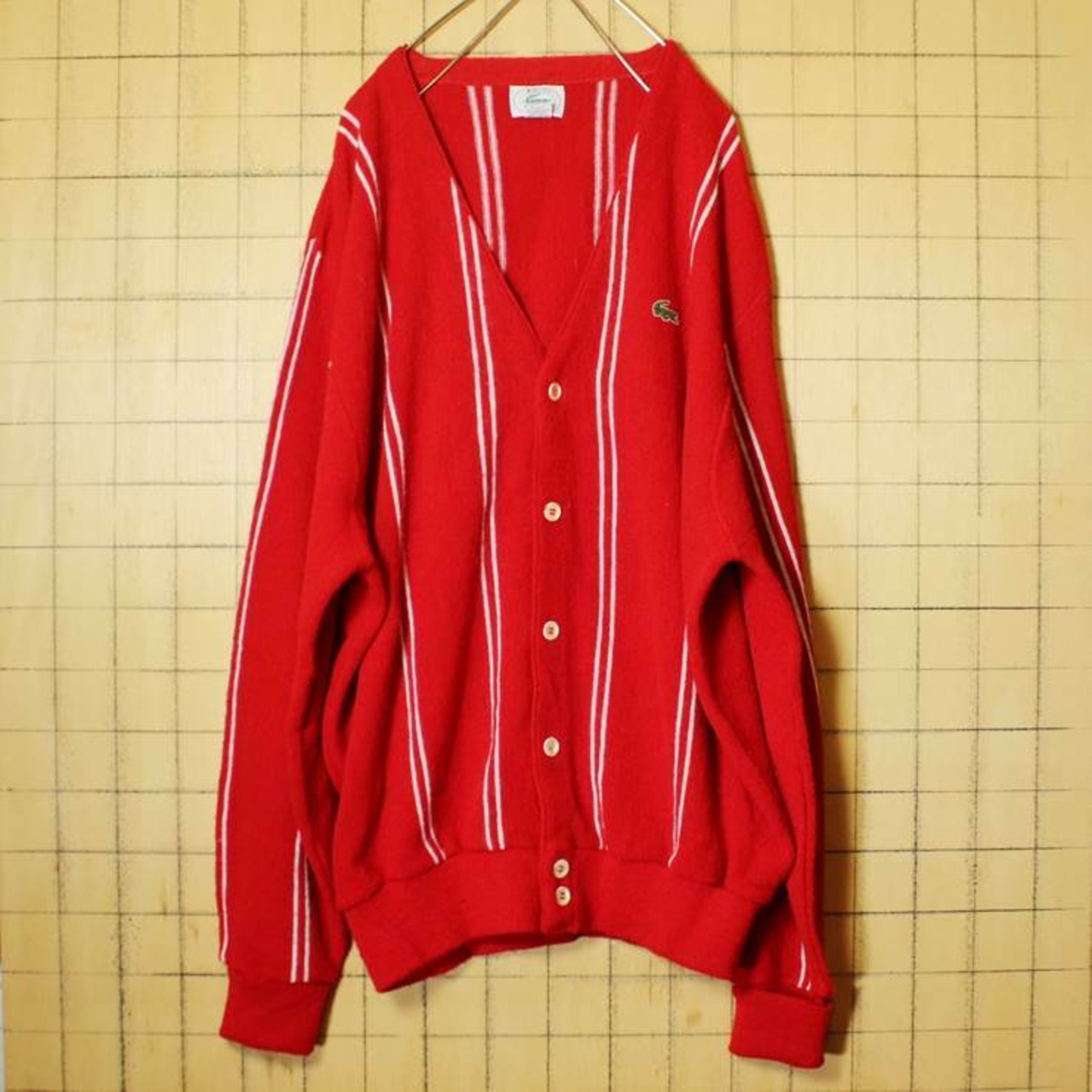 80s USA製 IZOD ラコステ LACOSTE ストライプ カーディガン アクリル ニット レッド メンズLです。