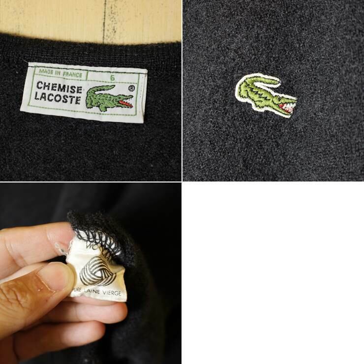 フランス製 70s フレンチラコステ LACOSTE Vネック ウールニット セーター ブラック メンズL相当です。