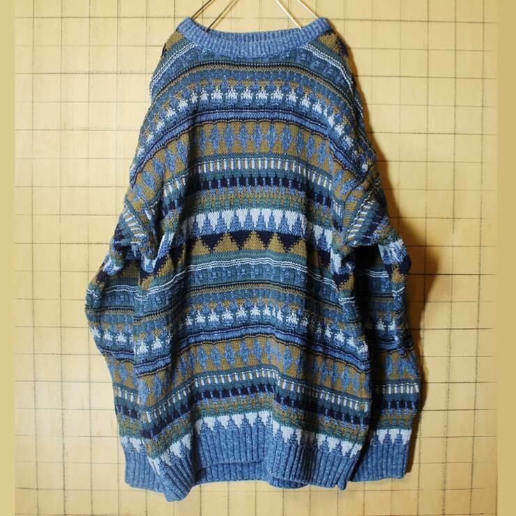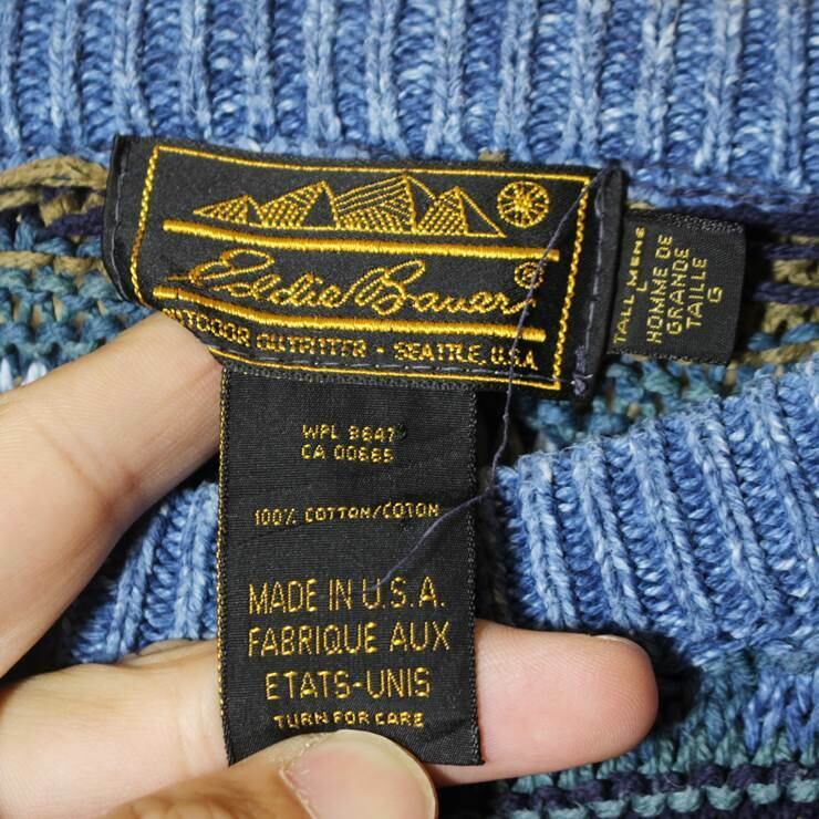 80s USA製 Eddie Bauer エディーバウアー 総柄 コットン ニット セーター メンズL ブルー 古着 091319aw141