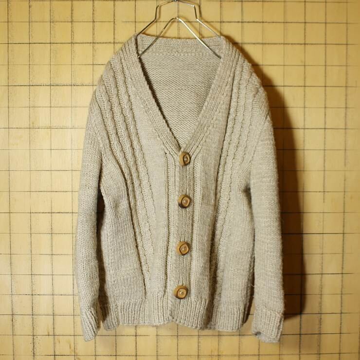 ヨーロッパ古着 ウール アラン ニット カーディガン メンズM相当 ベージュ Vネック 121119aw14
