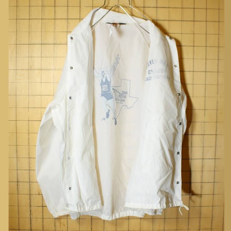 USA製 80s Pla-Jac ナイロン コーチジャケット ホワイト 白 メンズL プリント 古着です。