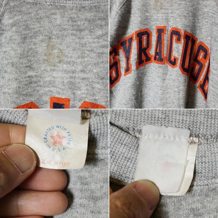 70s USA製 ARTEX カレッジ プリントスウェット 霜降り 杢グレー トレーナー レディースXL メンズML相当 SYRACUSE ラグラン ヴィンテージ 古着です。