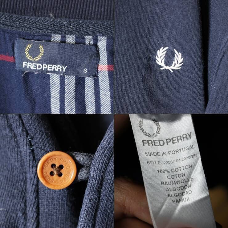 ポルトガル製 FRED PERRY フレッドペリー スウェット カーディガン ネイビーブルー 紺 メンズS ワンポイント 刺繍 古着です。