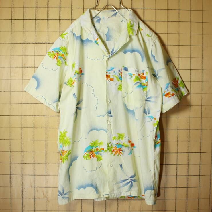 EURO コットン 総柄 アロハ ハワイアン ボックス シャツ イエロー メンズL相当 半袖 オープンカラー 開襟 ヤシの木 古着 051320ss74