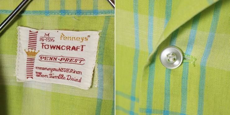 60s 70s Penneys オープンカラー 長袖 ボックスシャツ ライトグリーン メンズM チェック 開襟 ビンテージ 古着 081820aw32