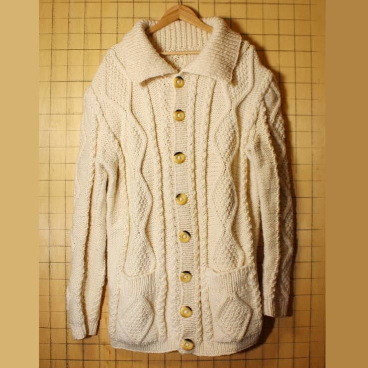 ビッグサイズ フィッシャーマン ウール カーディガン アランニット オフホワイト メンズ2XL相当 EURO ヨーロッパ 古着 081820aw23