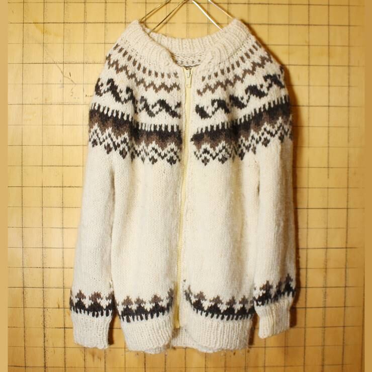 ウール アクリル 総柄 スノーフレーク カーディガン メンズML相当 ジップアップ ヨーロッパ古着 100720aw61