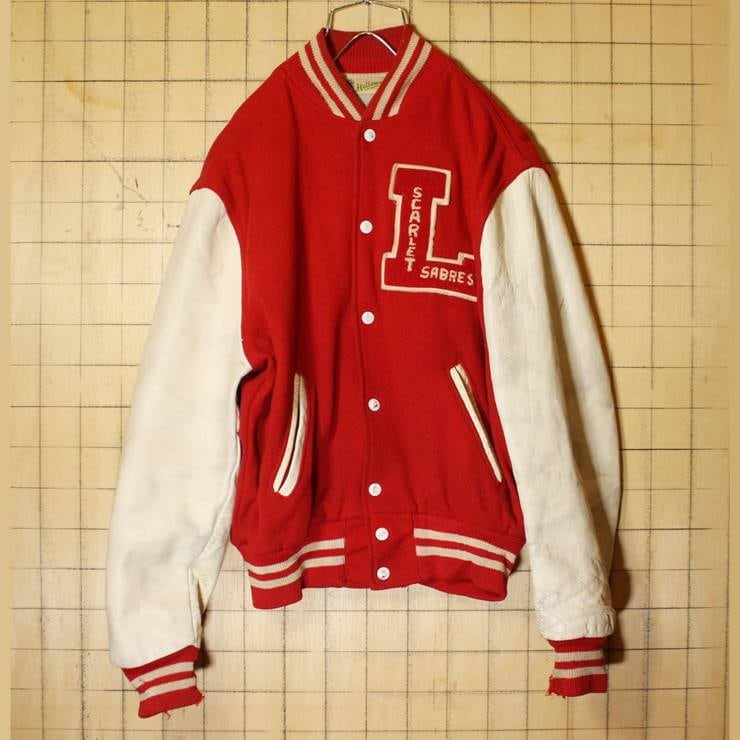 1950s USA製 Holloway 袖レザー スタジアムジャンパー レッド ホワイト メンズL相当 ワッペン アメリカ古着 112520aw55